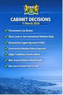 The Government of Sierra Leone has approved a series of key Cabinet papers covering procurement reform, judicial conditions of service, anti-fraud laws and steps toward abolishing the death penalty, showing a continued push for transparency and public accountability.