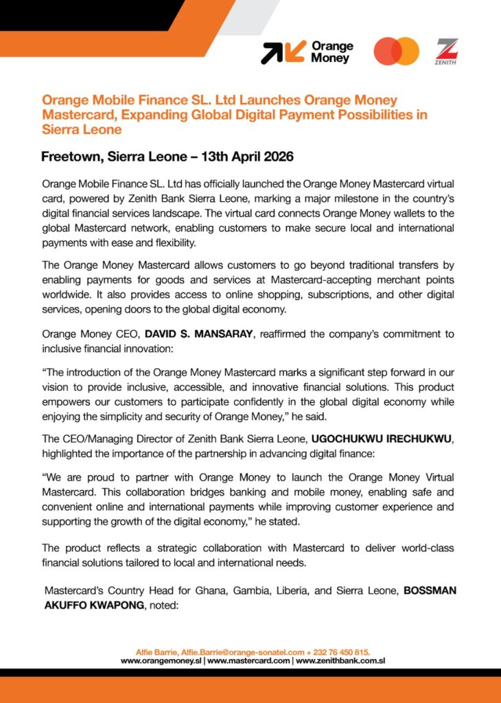 “We are delighted to collaborate with Orange Mobile Finance in Sierra Leone to drive digital transformation and enable seamless access to payments. Mastercard remains committed to empowering partners and customers through secure and innovative solutions,” he noted