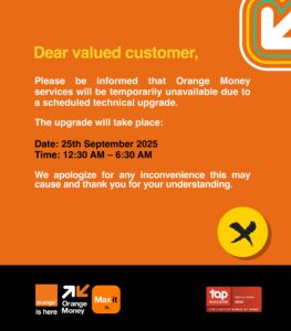• ORANGE MONEY TEMPORARILY UNAVAILABLE DUE TO TECHNICAL UPGRADE
