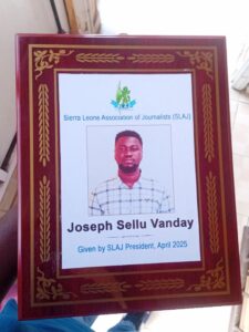 “As journalists, we interact with people from all walks of life,” Nasrallah said. “SLAJ initiated this recognition to celebrate individuals whose footprints have become an indelible mark on Sierra Leone’s development. We ensure that every nominee goes through a thorough vetting and background verification process to confirm the authenticity of their work. It is with great honour that I, as National President of SLAJ, present this Distinction Award to Joseph Sellu Vanday for his outstanding role in Innovation and Transformative Rural Healthcare Solutions.”